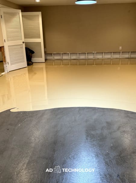 Basement floors often have uneven surfaces and moisture issues, making proper preparation crucial. In this project, we first applied a moisture vapor barrier to prevent potential adhesion problems. A self-leveling underlayment was then poured to create a smooth, flawless base. This allowed for the perfect application of a metallic epoxy coating, which gave the basement a stunning, high-gloss finish with depth and movement.