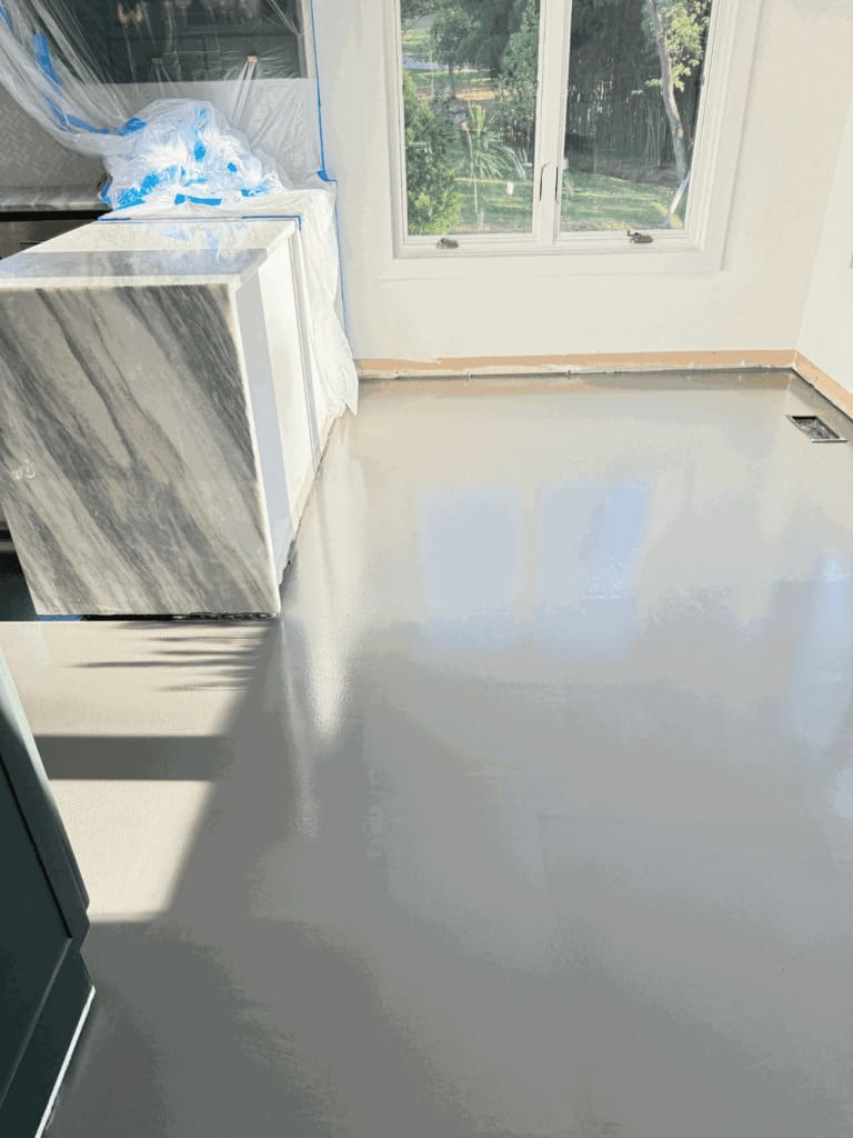 Kitchens: Self-leveling flooring with a painted finish is an excellent choice for kitchens due to its smooth, seamless surface, which makes cleaning a breeze. This design helps minimize dirt and bacteria accumulation, ensuring a clean and sanitary environment, which is essential in any kitchen. The durable coating protects against spills, stains, and moisture, maintaining both hygiene and aesthetics. Additionally, this flooring can withstand heavy foot traffic and the wear and tear that comes with a busy cooking environment. With a variety of colors and finishes available, you can easily customize the look to match your kitchen’s decor while enjoying the functional benefits of a resilient and low-maintenance surface.