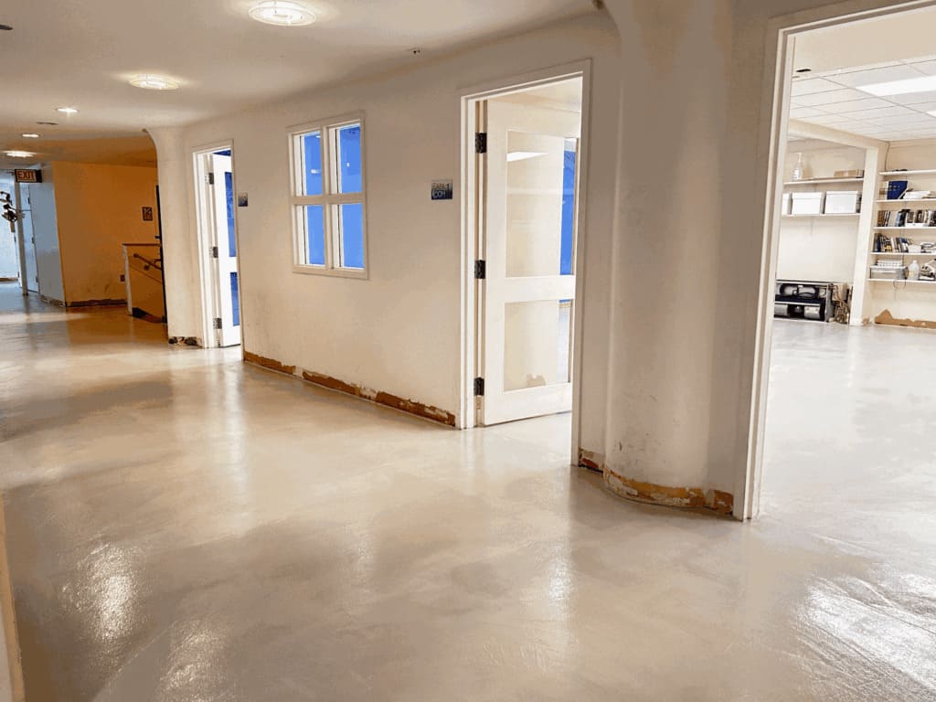 Microcement is an excellent solution for basements, particularly when creating a functional and cozy space. Its durability and moisture resistance make it ideal for basement areas, which often suffer from high humidity and temperature fluctuations. Microcement effectively prevents moisture penetration, significantly reducing the risk of mold and mildew—common issues in basement environments. If the basement is utilized as a living area, such as a home theater, game room, or home office, microcement will provide a long-lasting and aesthetically pleasing flooring option. However, we always recommend installing a moisture vapor barrier in basement applications to protect the flooring from capillary moisture seeping up from the concrete, thus extending the lifespan of the floor.